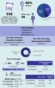 Beyond the influence of recreational cannabis legalization, several additional factors likely contribute to the observed rise in pediatric cannabis exposure. Recent literature has highlighted the significant impact of the COVID-19 pandemic on adolescent and family mental health, with increased stress, social disruption, and reduced access to routine support systems contributing to changes in substance use patterns.17,18 A New Jersey pediatric emergency department study reported that increases in cannabis use and exposure during this period were more strongly associated with pandemic-related psychological distress than with policy changes alone.19 Mental health and developmental vulnerabilities also play an important role, as up to half of the affected children in our study had psychiatric comorbidities such as major depressive disorder or post-traumatic stress disorder, and nearly a quarter had developmental conditions including ADHD. These underlying conditions are known to heighten impulsivity, emotional dysregulation, and susceptibility to self-medication, which may partly explain increased risk of intentional or unintentional cannabis exposure among youth.20,21